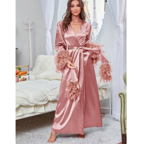 Robe de Chambre Longue en Satin Rose avec Plumes – Élégance et Confort