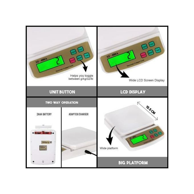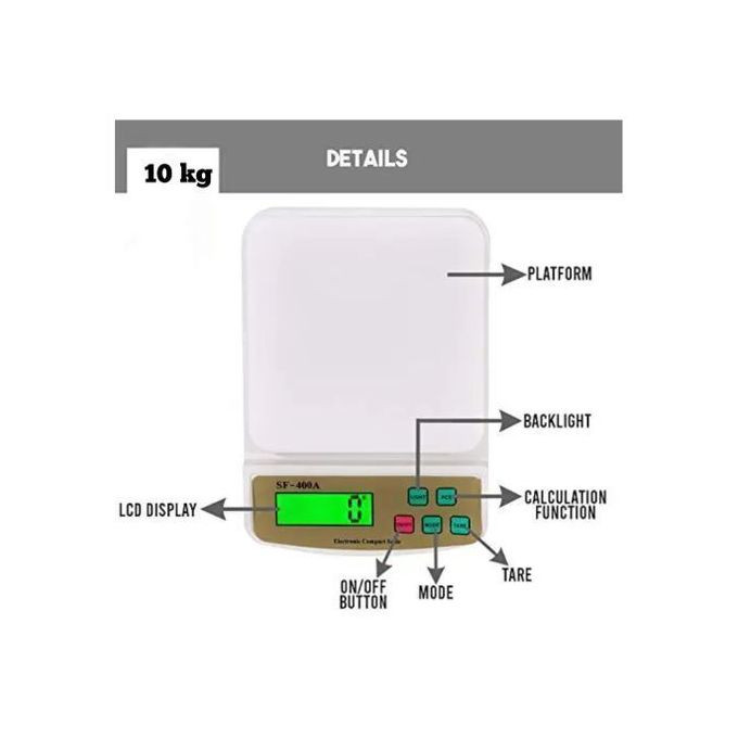 Capacité de pesée max : 10KG. Peut voir le poids en grammes (g)/ kilogramme (kg)/ livres (lb) / onces (oz)