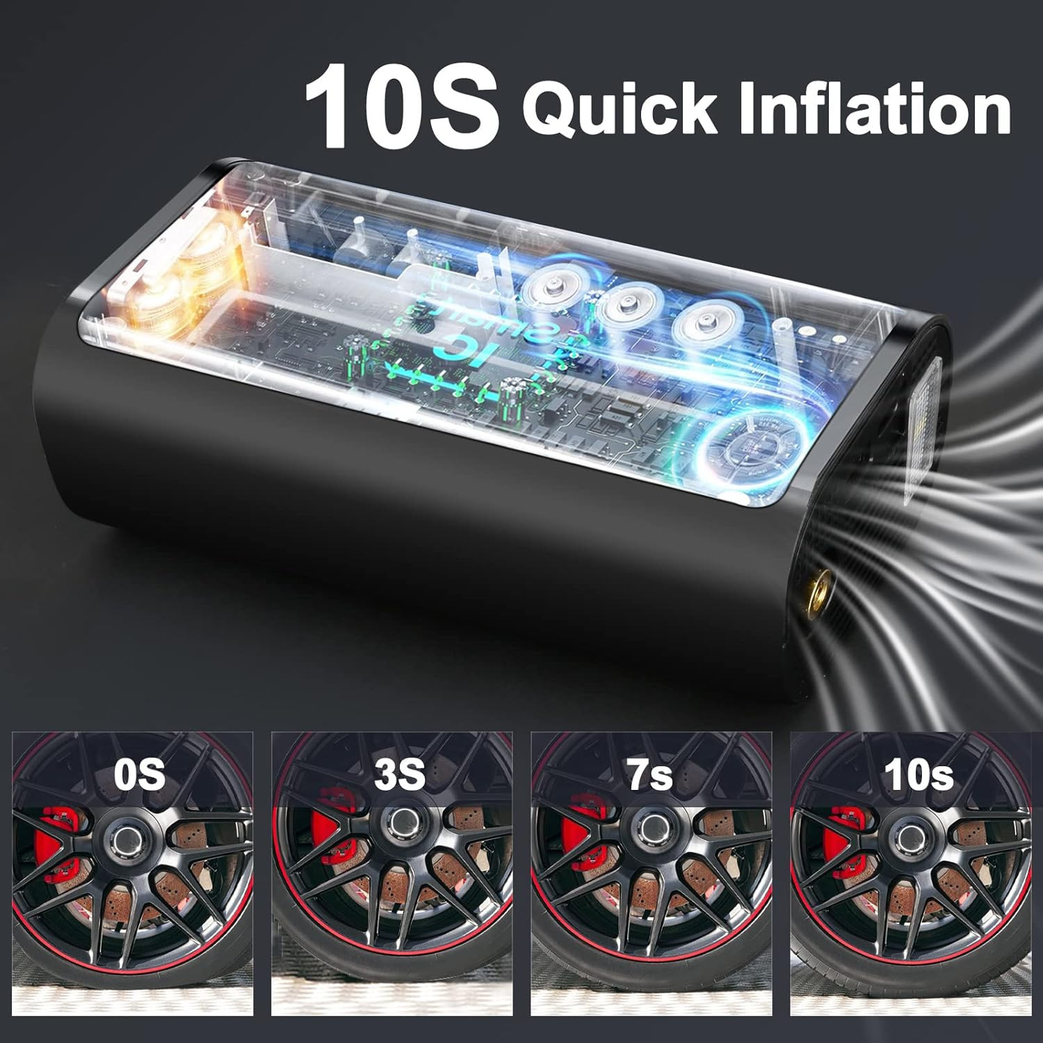 • GONFLAGE RAPIDE ET PRÉCIS : Avant de procéder au gonflage, abaissez le mécanisme de verrouillage de la valve. Le gonfleur de pneus portable est conçu avec une puce puissante et une batterie intégrée durable pour un gonflage rapide et un flux d’air à grande vitesse. En quelques minutes seulement, vous pouvez gonfler rapidement les pneus de votre véhicule à une pression précise de 150 PSI. En outre, il suffit de régler la pression souhaitée pour que le compresseur d’air portable atteigne la pression souhaitée. Le gonflage s’arrête automatiquement lorsque la valeur prédéfinie est atteinte, en toute sécurité et commodité !