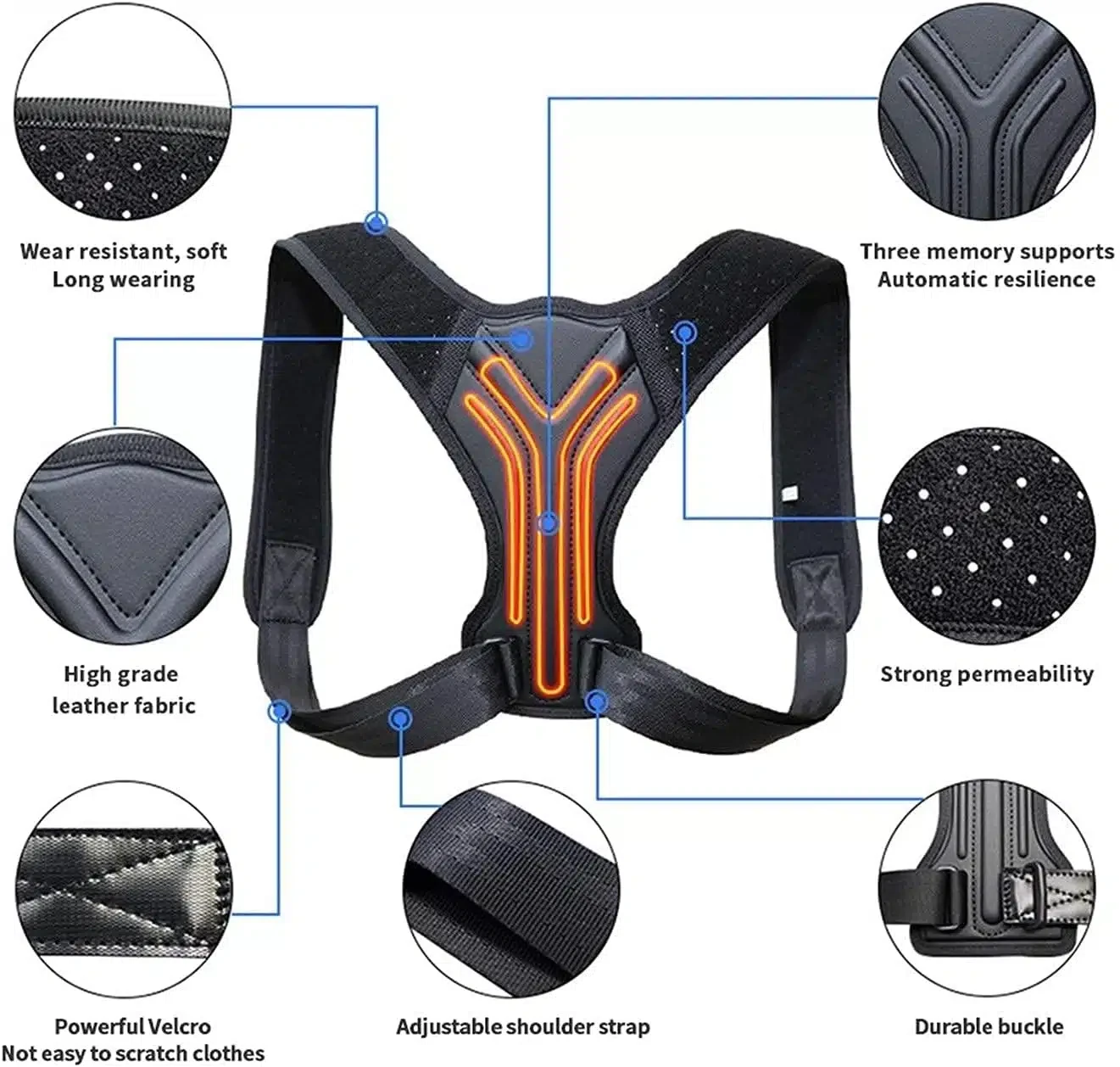 TAILLE RÉGLABLE standard. Correcteur de posture dorsale avec sangle de réglage respirante et sans latex. CORRECTION GÉNÉRALE – Support d’épaule Tirez le haut du dos vers la bonne position. Et puis améliorez la posture de tout votre corps pendant le travail ou la vie.
