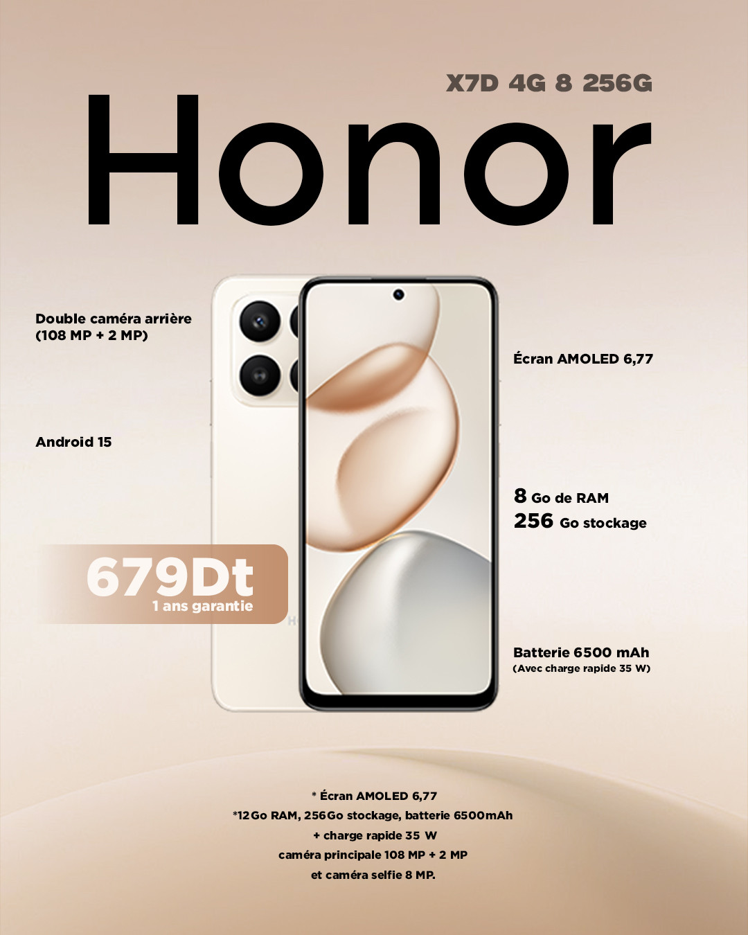 Le Honor X7d 4G avec 8 Go de RAM et 256 Go de stockage interne est un smartphone conçu pour offrir performance et fluidité au quotidien.