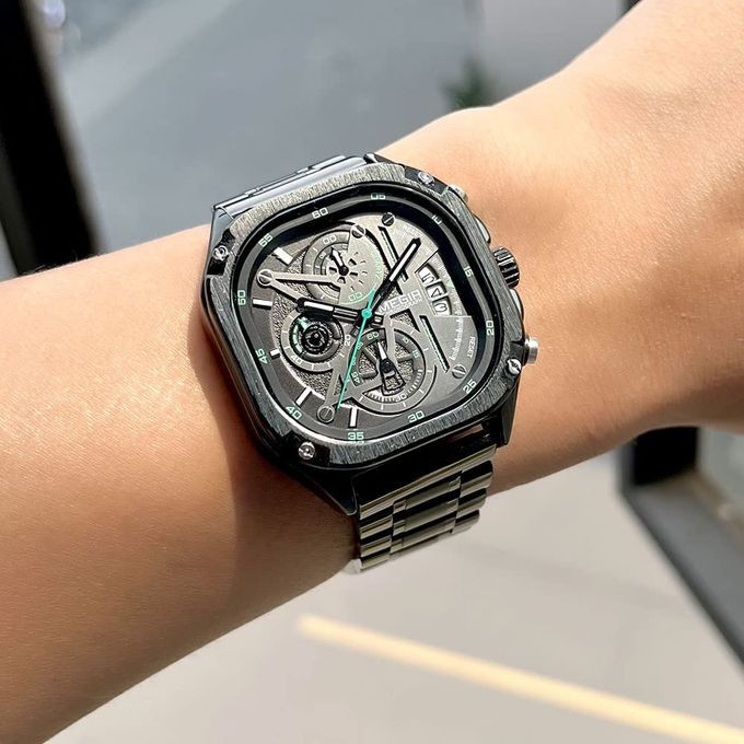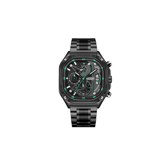 Caractéristiques: chronographe, étanche 3 atm, aiguilles lumineuses, calendrier, heure, minute, seconde