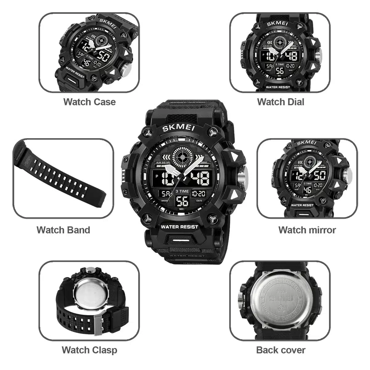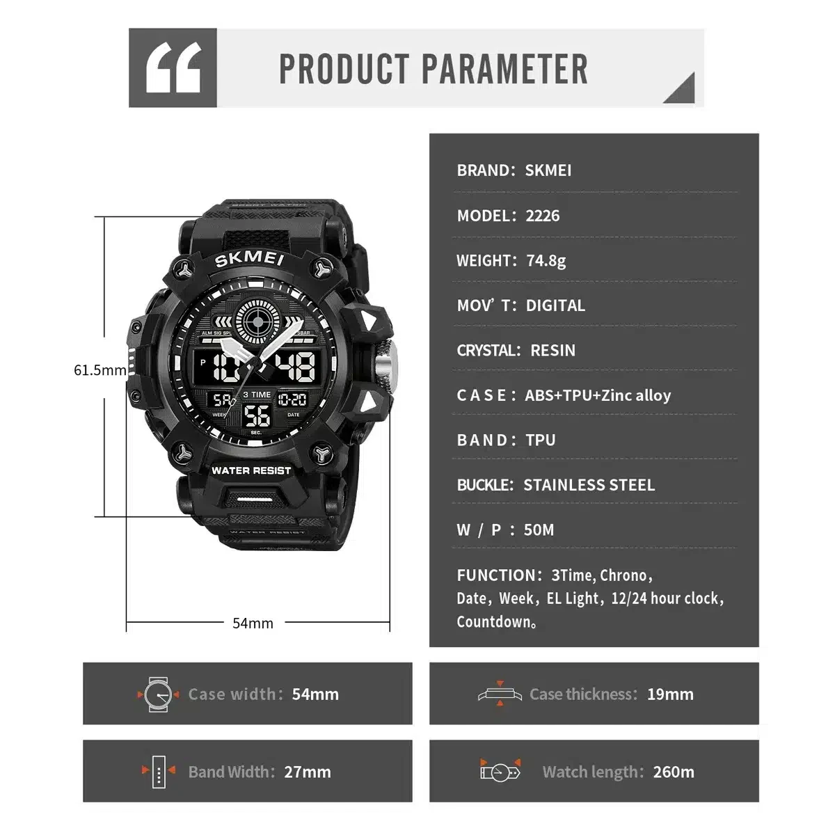 • Fonction : 2 Temps, chrono, alarme, date, semaine, lumière EL, horloge 12/24 heures, compte à rebours.