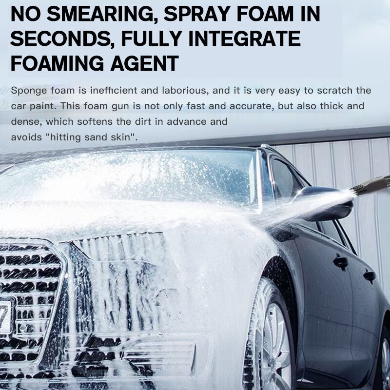 Allumez l’alimentation en eau, puis pressez la poignée de la buse de pulvérisation pour poser une épaisse couche de mousse sur le véhicule.