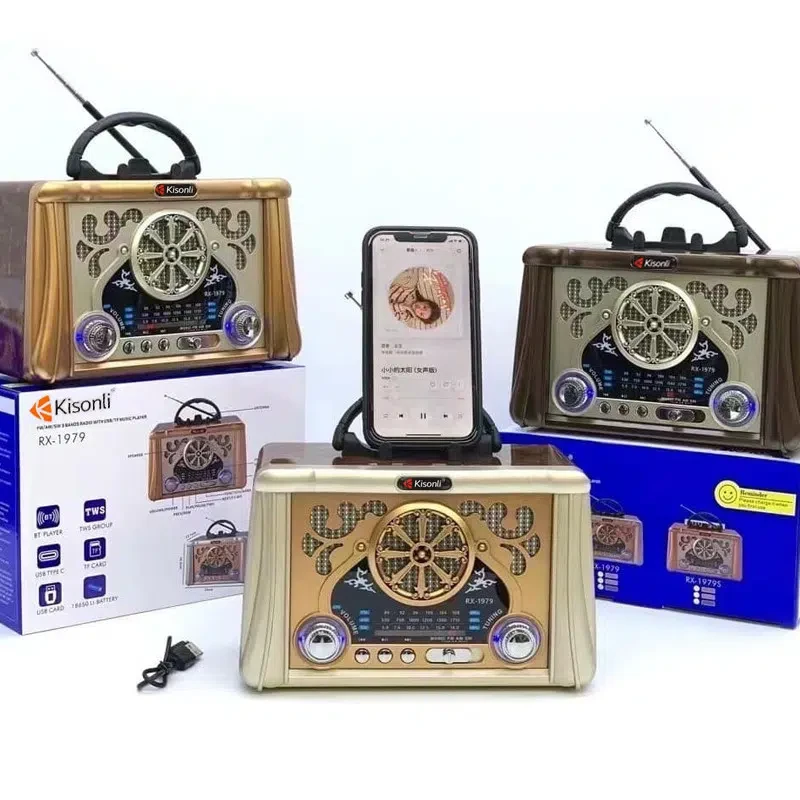 Radio FM Bluetooth Kisonli RX1979 - Bandes : AM, FM, SW - Puissance : 8W - Connectivité : Bluetooth 5.3 - Radio à charge solaire - Avec lecteur haut parleur 3 voies Pour USB - Chargement Type-C - Radio vintage portable - Emplacement de carte mémoire - Antenne haute sensibilité - Couleur : Bois - Garantie : 6 mois