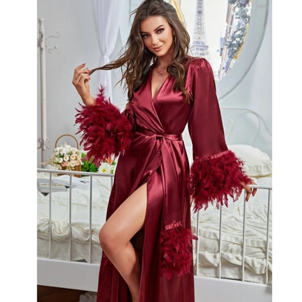 Robe de Chambre Longue en Satin Rouge Bordeaux avec Plumes – Élégance et Raffinement
